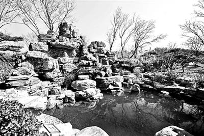 西侧山坡底部,错落有致的假山怪石与一汪清涧相映成趣。水面上横跨着一座汉白玉拱桥。过了石桥往南走,便是一道木质半圆形长廊。