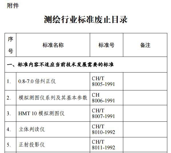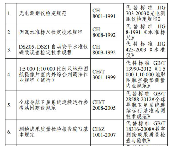 根据《中华人民共和国标准化法》、《行业标准管理办法》和《测绘标准化管理办法》有关规定,按照国务院《深化标准化改革工作方案》和国家标准化管理委员会《推荐性标准集中复审工作方案》的有关要求,经对推荐性测绘行业标准进行集中复审,我局决定废止《地理信息元数据服务接口规范》等21项测绘行业标准(目录见附件)。此21项标准自本公告发布之日起停止实施。