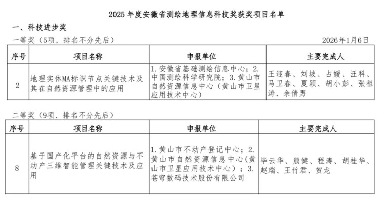 近日,安徽省测绘地理信息学会正式公布2025年度安徽省测绘地理信息科技奖评审结果,由黄山市自然资源信息中心组织实施、我公司重点参与并提供技术支撑的两项成果脱颖而出,分别荣获2025年度安徽省测绘地理信息科技进步奖一等奖1项,二等奖1项。