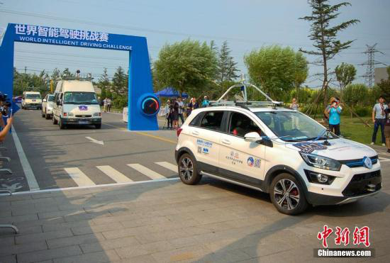 6月28日,无人驾驶车辆驶出赛道。当天,作为世界智能大会的重要活动,世界智能汽车挑战赛在天津拉开帷幕。 中新社记者 佟郁摄