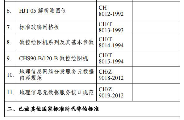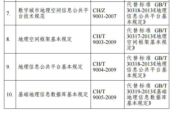 根据《中华人民共和国标准化法》、《行业标准管理办法》和《测绘标准化管理办法》有关规定,按照国务院《深化标准化改革工作方案》和国家标准化管理委员会《推荐性标准集中复审工作方案》的有关要求,经对推荐性测绘行业标准进行集中复审,我局决定废止《地理信息元数据服务接口规范》等21项测绘行业标准(目录见附件)。此21项标准自本公告发布之日起停止实施。