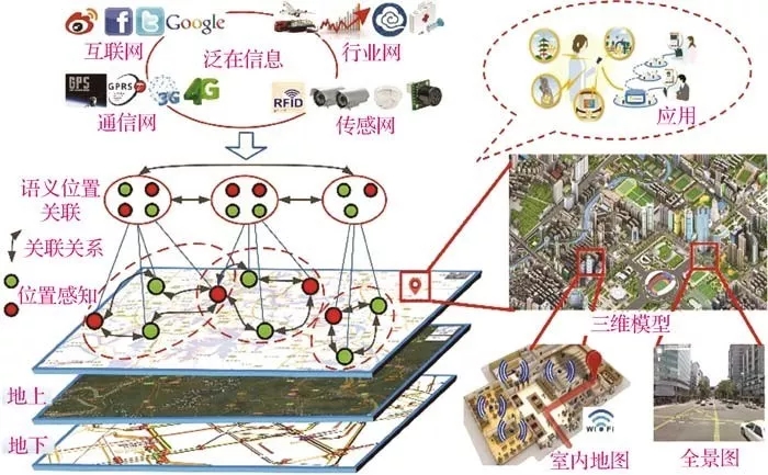 全息位置地图实时或近实时地从互联网、传感网、通信网等构成的泛在网中获取泛在信息,这些获取的信息通过语义位置在地图上汇聚关联。全息位置地图的表现形式多样,包含二维矢量、三维场景、全景图、影像地图等多种形式,并且实现室内室外、地上地下一体化。图1 显示了全息位置地图的概念示意图。