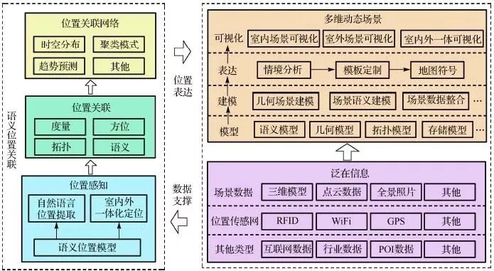 其中,语义位置关联以语义位置模型(黄亮,2014)为基础,动态感知泛在信息中存在的位置信息,并基于度量、方位、拓扑和语义等简单的位置关联和通过时空分布、聚类模型和趋势预测等方法形成深层次的位置关联网络,实现全方位的语义位置关联。多维动态场景的技术框架则分别从场景模型、建模、表达与可视化几个方面构建。