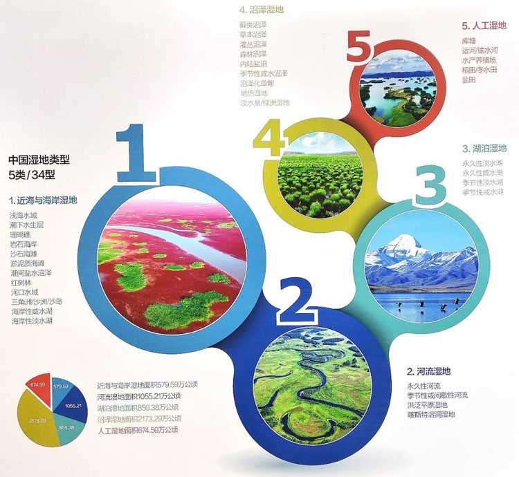 中国是全球湿地类型最齐全的国家之一,涵盖《湿地公约》定义的所有湿地类型,包括近海与海岸湿地、河流湿地、湖泊湿地、沼泽湿地和人工湿地等。