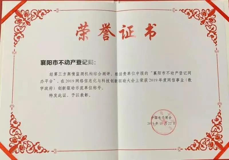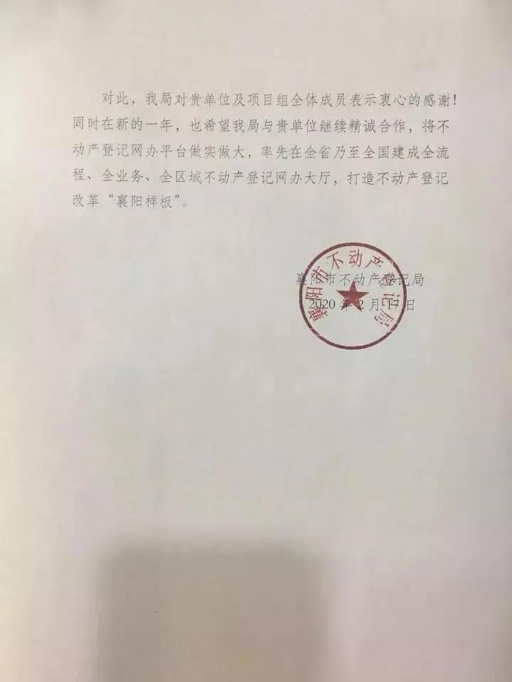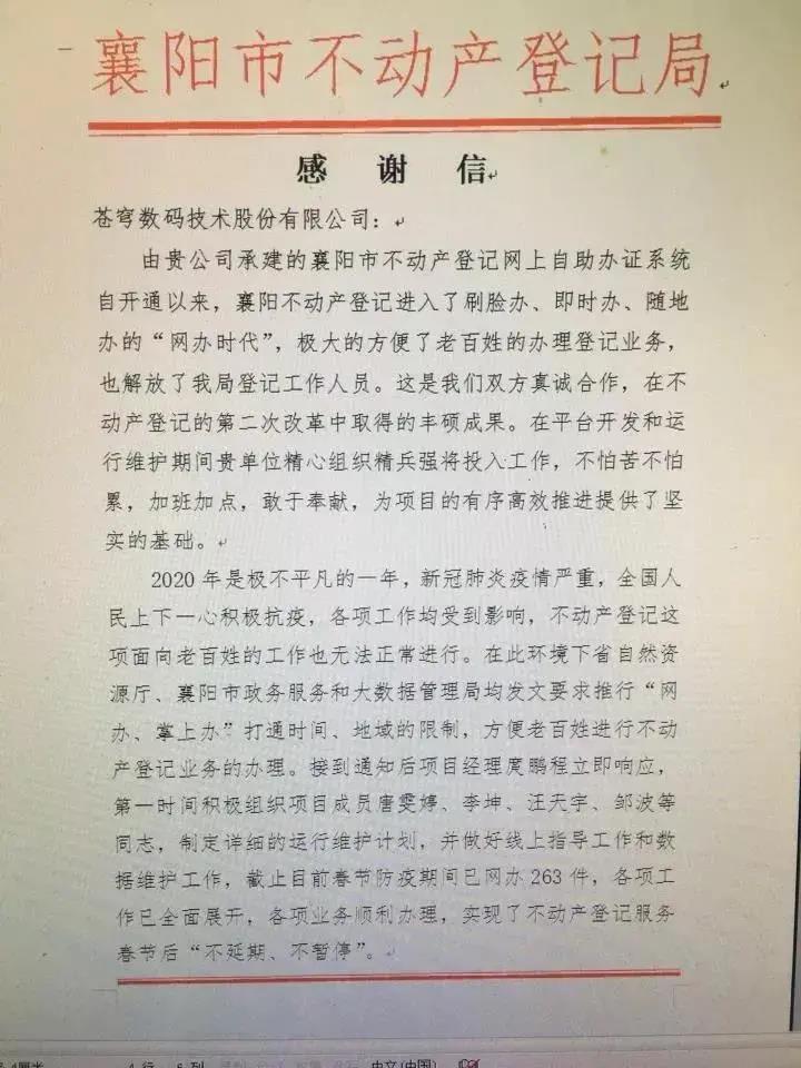 该项目多次受到省市级政府的肯定与表扬。2019年11月,襄阳市不动产登记网办平台获奖;2020年2月17日,襄阳市不动产登记局给苍穹数码送来感谢信,为苍穹不动产登记网办平台技术及一线技术服务人员点赞;与此同时,成功入围湖北省政府办公厅关于对2019年落实有关重大政策措施真抓实干成效明显地方的通报奖励名单。