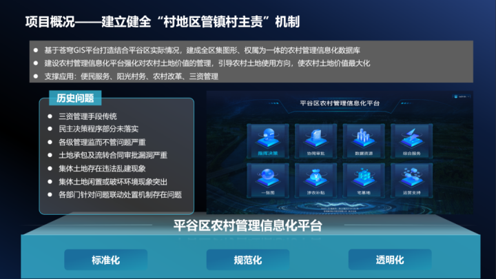 (3)场景探索,促进数据要素价值释放。以平谷农村土地治理为切入点,统筹平谷土地资源管理,加强对农村“三资”(资源、资产、资金)的管理,使“三资”管理更加标准规范透明化。
