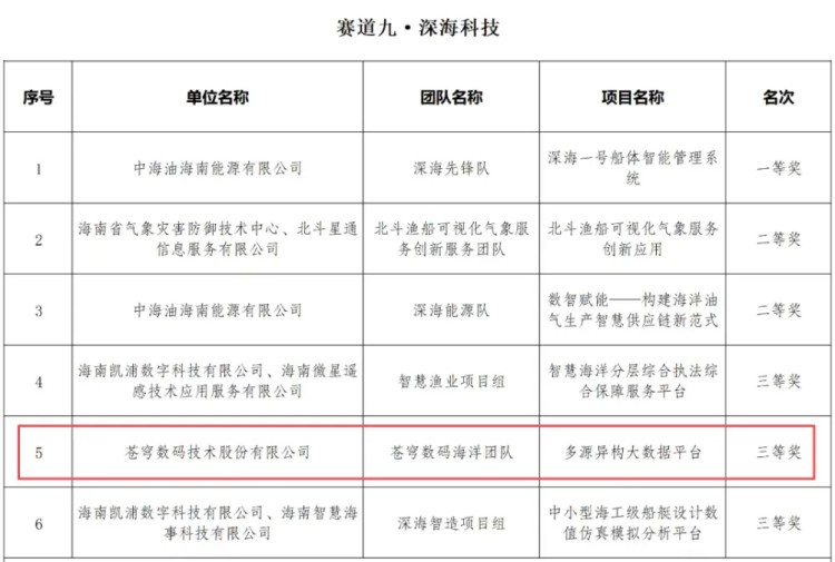 面对评审专家的专业质询,团队成员从容应对,深入阐述项目在技术创新、实际应用效果及未来产业化前景等方面的优势,得到了评审专家的高度认可,最终从众多优秀项目中脱颖而出,成功拿下深海科技赛道三等奖,彰显了苍穹数码在数据要素与深海科技融合领域的硬实力。