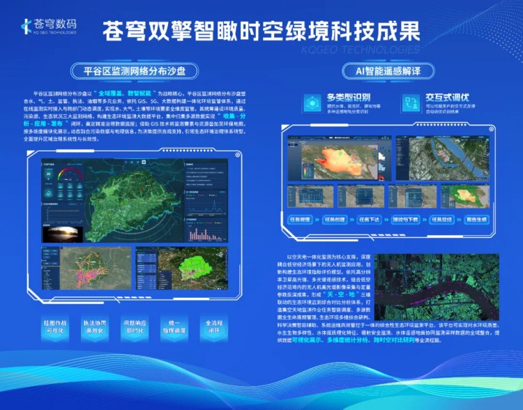 展区核心亮点为“苍穹双擎智瞰时空绿境科技成果”。该成果依托公司自主研发的KQGIS与KQRS平台技术,构建了平谷区生态环境监测网络分布沙盘及AI智能遥感解译模型,实现了对区域环境多要素的动态感知、智能分析和可视化管控。