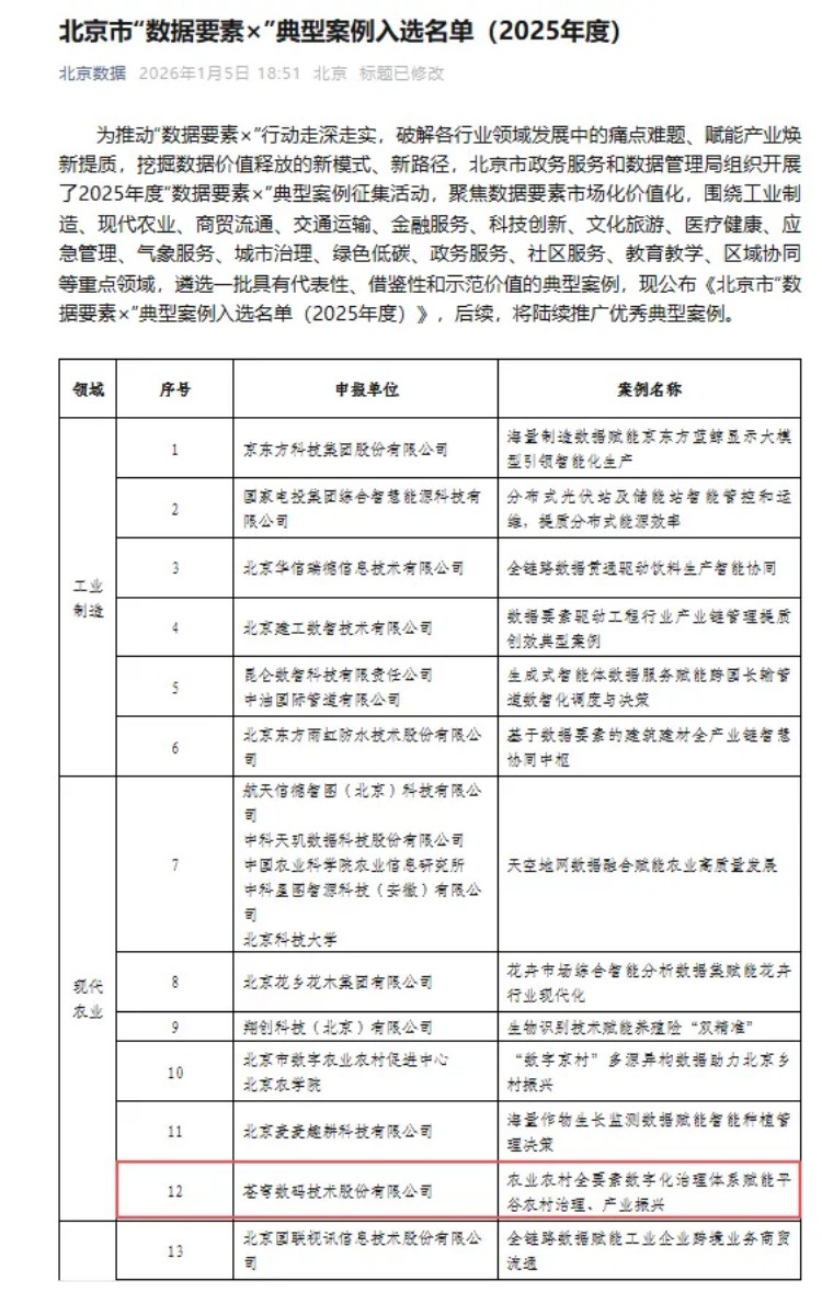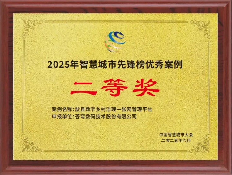 2025年,苍穹数码凭借扎实的项目实践与创新的技术方案,屡获行业权威认可,品牌影响力持续提升。在重要赛事与案例评选中,“农业农村全要素数字化治理体系赋能平谷农村治理、产业振兴”项目入选2025年度北京市“数据要素×”典型案例;“歙县数字乡村治理一张网”荣膺2025智慧城市先锋榜优秀案例二等奖……多项成果彰显了公司在数据要素赋能农业农村领域的领先实力。
