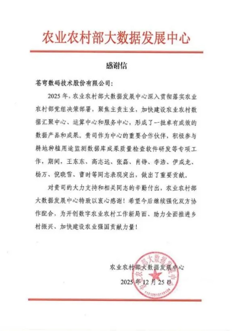 在口碑认证方面,公司收到农业农村部大数据发展中心的感谢信,这充分体现了政府部门对双方合作成效的高度认可,彰显了公司在数字农业农村领域的专业实力与服务价值。