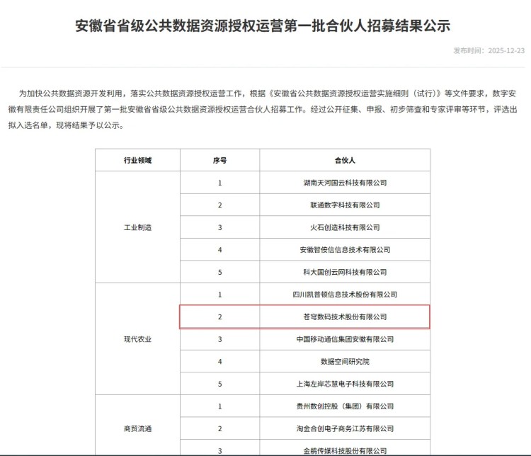 苍穹数码深知生态协同的重要性,2025年积极拓展合作版图,构建多元协同的产业生态。在政务合作维度,成功入围安徽省省级公共数据资源授权运营第一批合伙人,为探索农业农村公共数据价值转化奠定坚实基础;在市场协作层面,与杭州天谷信息科技有限公司(e签宝)、杭州安铂数据科技有限公司、数字安徽有限责任公司、江西省亿发姆科技发展有限公司等企业达成相关合作,整合各方资源优势,实现技术互补、业务协同,共同推动农业农村数字化生态产业的完善与升级。