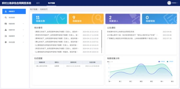 苍穹土地承包经营权二轮延包档案管理系统,积极响应《第二轮土地承包到期后再延长30年试点工作档案管理办法》规定,覆盖二轮延包过程中的文件材料收集、整理、归档、保管和利用等各个环节,实现档案的统一管理、分级实施、分类存放和集中保管,以科技的力量确保每一份档案都“有据可查、有迹可循”。
